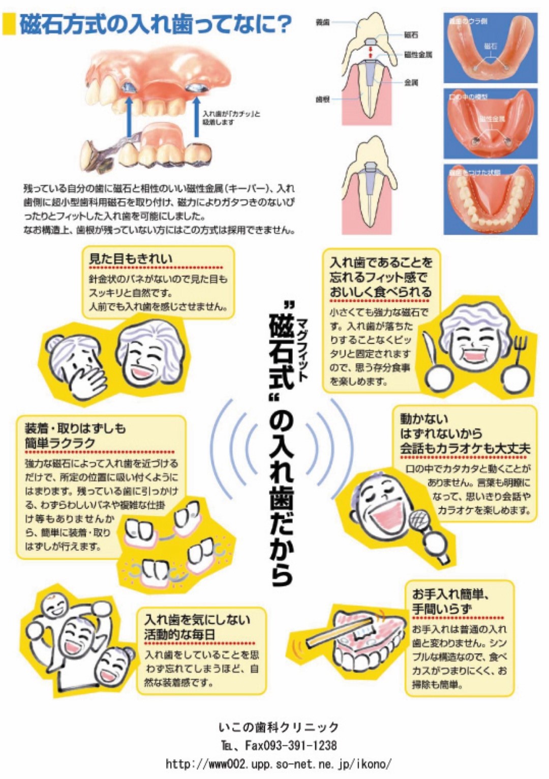 残っている自分の歯やインプラントに磁石と相性のいい金属を、入れ歯のほうに超小型磁石を取り付けることで、