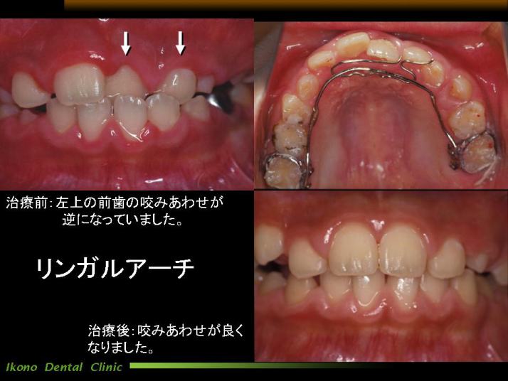 | 当院での治療例(クリックで拡大) ちょっとした”ボタンの掛け違え”でしょうか、上の前歯が下の前歯より後ろに位置してしまいました。 リンガルアーチという矯正装置を用いて咬み合わせを改善しました。 アゴの生長完了前の早い時期に開始しましたので、患者さん本来のアゴの成長でキレイになりました。 |